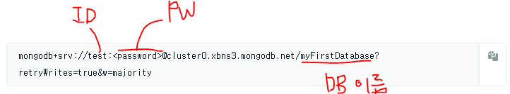 mongoose.connect('mongodb+srv://아이디:패스워드@kift.q7pbt.mongodb.net/디비이름?retryWrites=true&w=majority', {
