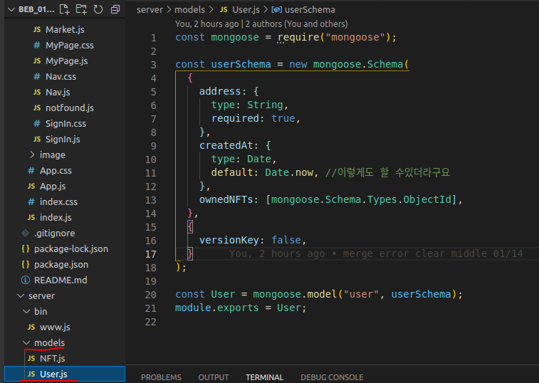 1. Server를 MongoDB에 연결시키고 models 폴더안에 생성할 테이블명으로 JS를 만든뒤 상단처럼 코드를 작성한다.