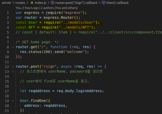 데이터를 CRUD를 하기위해 위에 models안에서 만든 테이블을 require로 불러와주고 아래쪽에서 find나 CRUD를 하면된다.