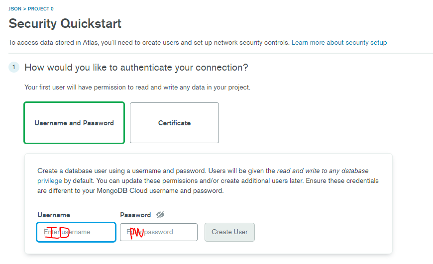 4. 유저를 생성한다. 입력한 아이디 비밀번호는 이후에 DB연결이나 mongo compass에서 사용된다.