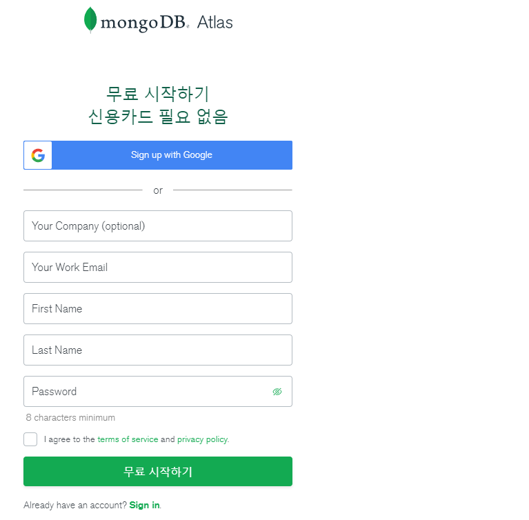 1. mongoDB 아틀라스라는 클라우드를 가입한다.