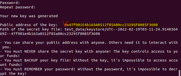명령어 입력뒤 우리가 웹지갑에서 지갑을 만들때 처럼 비밀번호를 입력해준다. 비밀번호를 입력하고 나면 지갑주소가 나오게 되는데 이는 이후에 genesis.json에 사용되기 때문에 기억해두자!!!