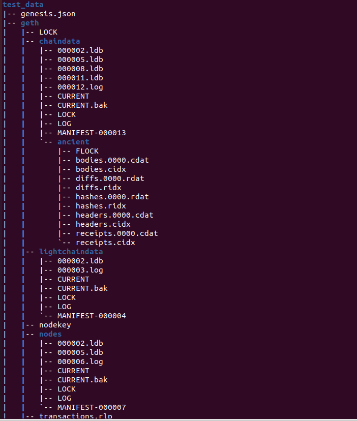 나는 어제 밤에 한번 작동을 시켜본적이 있어 트리구조가 다르게 나올 수 있다. 무시하자~ 트리구조를 잘 보길바란다. 이제 우리는 geth로 채굴을 해보고 트랜잭션을 날려볼것이다.
