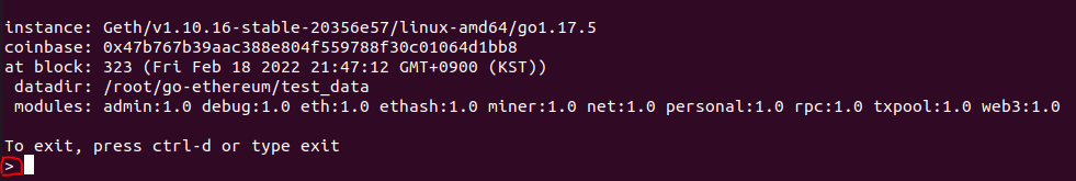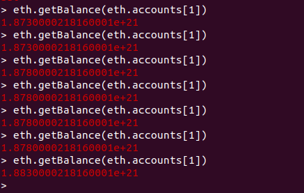 채굴을 종료할려면 miner.stop() 명령어를 쓰면되고 당연 채굴보상은 처음에 지정한 인덱스 1번계정이 받게되고있다. 여기서 확인해볼건 보상을 잘받고 있는지 인덱스1번의 발란스를 찍어보면 된다.