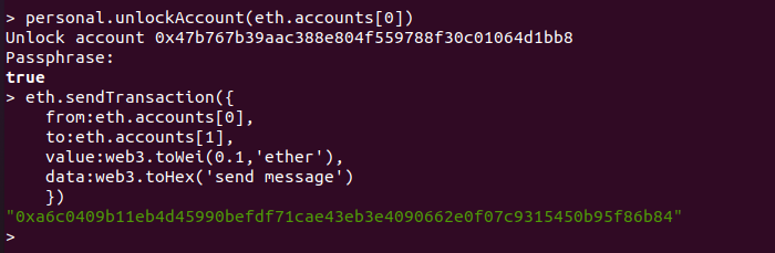그런 다음 인덱스0번 지갑에서 인덱스1번지갑으로 0.1이더를 전송하는 트랜잭션을 생성해보자 생성전 먼저 지갑을 해제해준다. unlock!!!