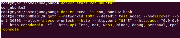 우리가 금방 만든 con_ubuntu를 사용해 con_ubuntu2 컨테이너를 8545포트를 열어 실행시키고 컨테이너를 만들게 된다. 이후 이전 포스팅한 글처럼 geth를 가동하면 localhost:8545로 서버가 접속할 수있다.