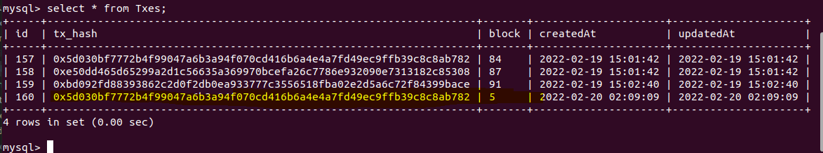 daemon.js 를 pm2로 동작시키면 getBlock함수가 작동되고 내부에선 아까 익스포트로 받은 함수가 실행된다. 실행이 완료 되면 결과를 tx.hash와 block넘버를 받아 DB에 차곡차곡 쌓게된다! 이제 geth든 web3를 이용해서든 송금트랜잭션을 하나 만들어 블록에 올리고 데이터베이스에 담아보자