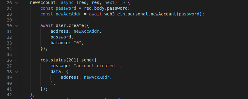 해당 newAccount의 요청 주소는 http://localhost:3000/account/new 이다. 페이로드로 password를 보내야하며 이는 우리가 마이이더월렛 같은 웹지갑등에서도 지갑을 만들때 들어가는 비밀번호와 비슷한개념이다 요청을 날리게 되면 나의 블록체인에 web3로 접근하여 새 계정을 만들어준다. 그리고 내 서버의 DB에 비밀번호와 주소를 저장시키게 된다.