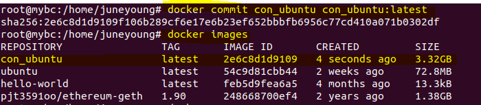 이미지를 생성할때는 commit이라는 명령어를 사용한다. 나는 con_ubuntu라는 이미지를 새로 만들것이니