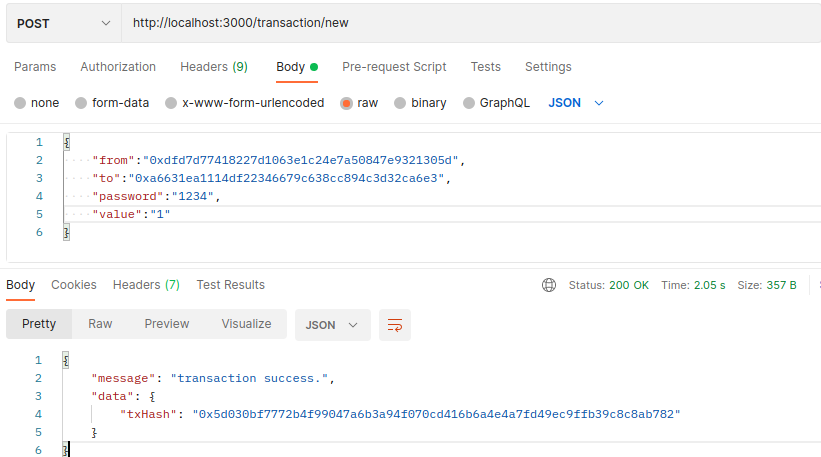 트랜잭션을 만들었고 전송됐다. txhash를 반환받았으며 이후에 pm2를 돌려 입출금을 감시할때 우리 데이터 베이스에 해당 tx와 블록넘버가 담겨야 할것이다.