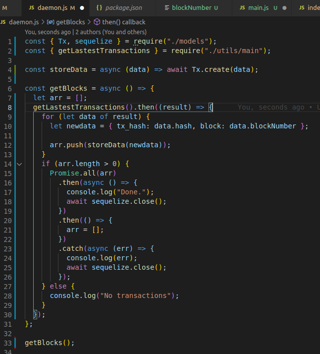 입출금을 확인하는 코드를 작성하여 pm2로 특정 시간마다 계속 동작시키게 하면 새로운 블록이 생성되면 그 블록이 입출금 블록인지 확인하여 내 DB에 저장시키게 될것이다. 여기서 고려해야할 것은 한번 동작 시킬때마다 제네시스 블록부터 검사하면 이미 검사한 블록까지 새로 검사하게 되므로 불필요한 행동을 많이하게 될 것이다. 이를 blockNumber라는 파일을 하나만들어서 안에 든 숫자를 지금까지 검사한 블록수로 저장시키고 다음 동작을 할때 이 저장된 최근 검사 블록수 보다 한자리 높은 수부터 검사하면 효율적이게 될 것이다. 이제 작성된 로직을 살펴보자.