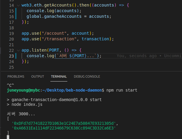 node로 index.js를 돌리게 되면 아래와 같이 index.js안에 있는 getAccount에 의해 위 생성된 지갑들이 서버단 터미널에 보이게 된다.