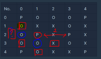 3. 2이하인 거리두기를 안지키고 있을 가능성이 있는 P들만 calcperson에 담기고 되고 이제 각 P마다 자신주변에 파티션이나 빈테이블 위치를 조사한다. P를 기준으로 주변에 X가 있으면 상관없지만 O가 있는곳은 O를 중심으로 아래 옆 총 3면을 검사하여 그중에 하나라도 P가있으면 FALSE를 리턴해야한다.