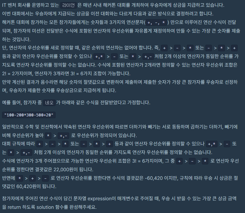 숫자는 연산자가 오로지 3개뿐이다. 그래서 연산자로 총 나올 수 있는 경우의 수는 3!으로 6개이다. 이 경우의 수를 모두 prior 배열에 담아 이중 for문으로 풀면서 문자열에 해당하는 연산자가 있는지 체크하고 있을때까지 모든 6개의 연산자 경우의 수를 도는 것이다. 그중에서 절대값처리를 하여 가장 높은 수를 리턴하면된다.