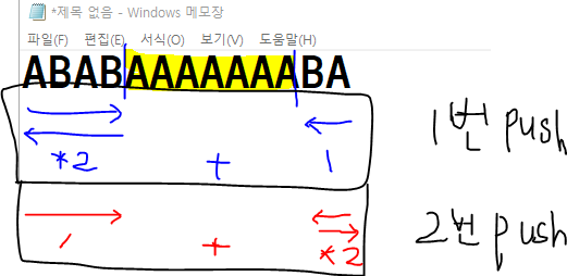 기준인덱스와 NAME길이에서 최종 INDEX+1한 값을 빼준 값이 시작과 뒷시작 수가 된다. 여기서 시작인덱스는 startOfA, 뒤에서 바꿀 갯수는 length - endOfA이다. 각각 leftRightCountList에 담아주기전 위 메모장에서 보면 ABAB가 갔다가 돌아오기때문에 *2 를 해주고 뒤에 BA는 한번이니 그냥 더해주어 담아주면된다.