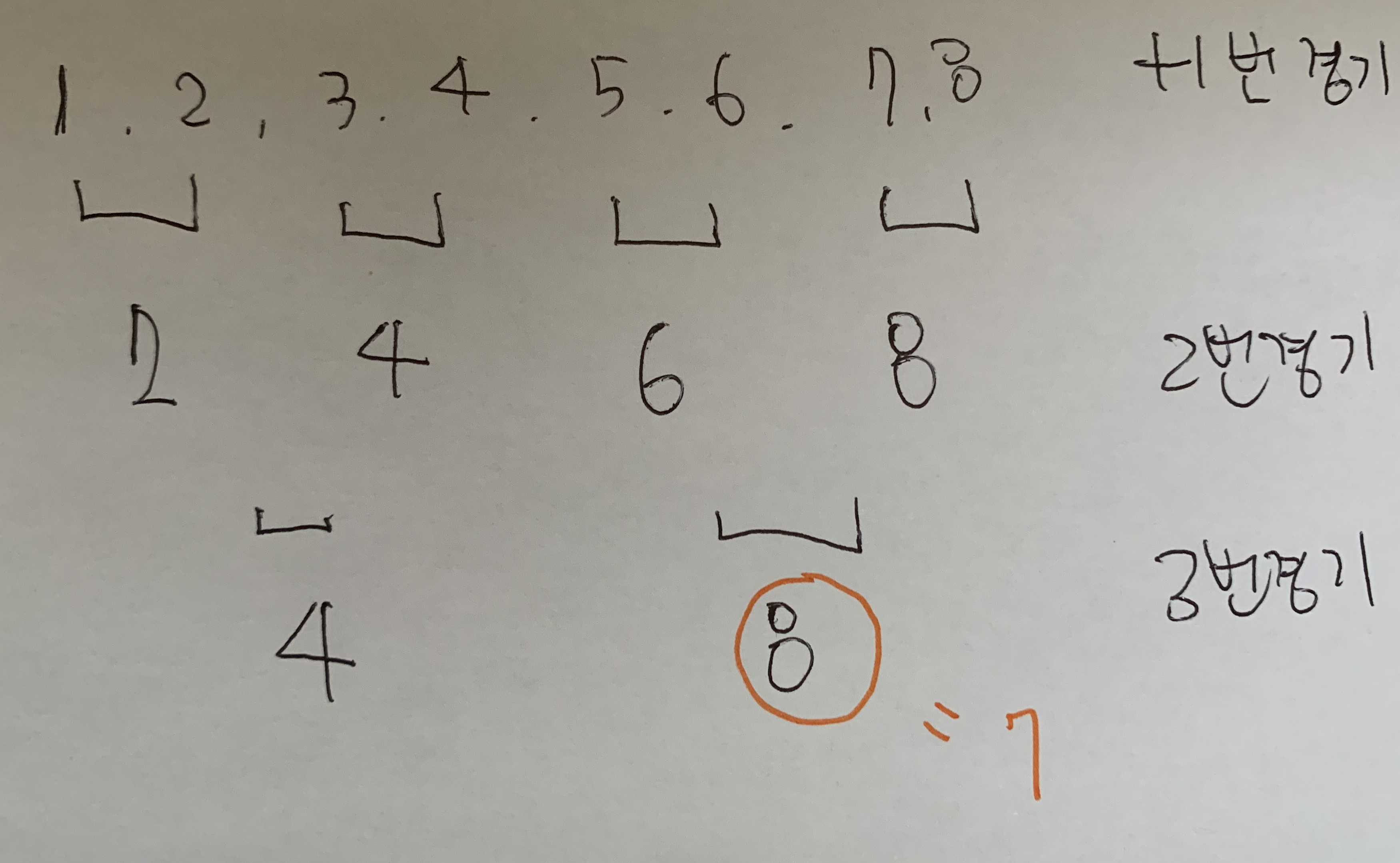1,2,3,4,5,6,7,8 참가자가 있으면 다음경기 때는 1,2중 아무나, 뭐 2가 내려오고 3,4중 4가 5,6중6이 이렇게 내려와서 다음경기를 진행하게 된다. 아래처럼 2씩 나누게 된 몫을 확인해보자 맨 아래 4와 8이 만나고 여기서 8은 7이나 상관없게 된다. 처리조건 아래를 잘 살펴보면 된다.
