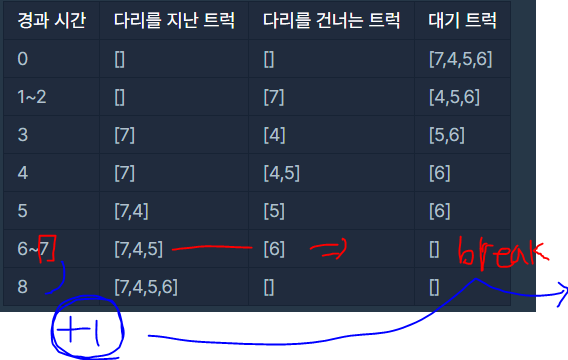 while문이 종료되는 조건은 현재 다리에 있는 트럭이 없어야하고 다리를 건너기전에 기다리는 트럭도 없어야한다. 또한 리턴을 해줄때 time은 아래처럼 다리를 다건넌 0이되는 순간 shift하고 바로 if문으로 검사하여 while문을 빠져나오므로 +1를 하여 리턴해줘야한다.