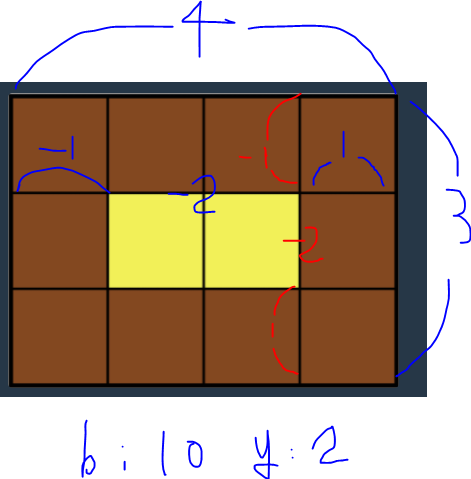 sqrt를 사용해 for문을 최소한으로 돌리는 약수 찾기 함수를 생성하여 b+y를 인자로 전달한 뒤 1,2,3을 담아 내림차순으로 정렬하여 리턴해주게 된다. 받은 1,2,3을 for문으로 다시 돌려 각 1,2,3마다 x,y축을 구하며 가운데 노란카페트가 깔리면 그 주위에는 1개의 갈색 테이블들이 깔린다는 점을 이용해 x-2와 y-2를 곱하면 가운데 노랑색이 나와야한다. 해당 조건에 일치하는 x,y를 구하자마자 바로 return 하며 for문을 종료시킨다.
