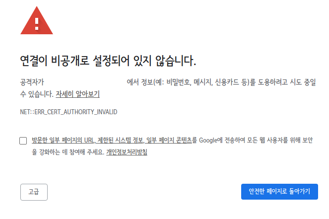 브라우저는 접속시 서버로 부터 응답을 받게 되는데 이 응답에는 인증서가 있고 인증서는 발급한 CA정보가 있으며 인증된 CA가 아닌 곳에서 발급한 인증서라면 크롬에서 자주보이는 아래와 같은 화면을 볼 수 있다.