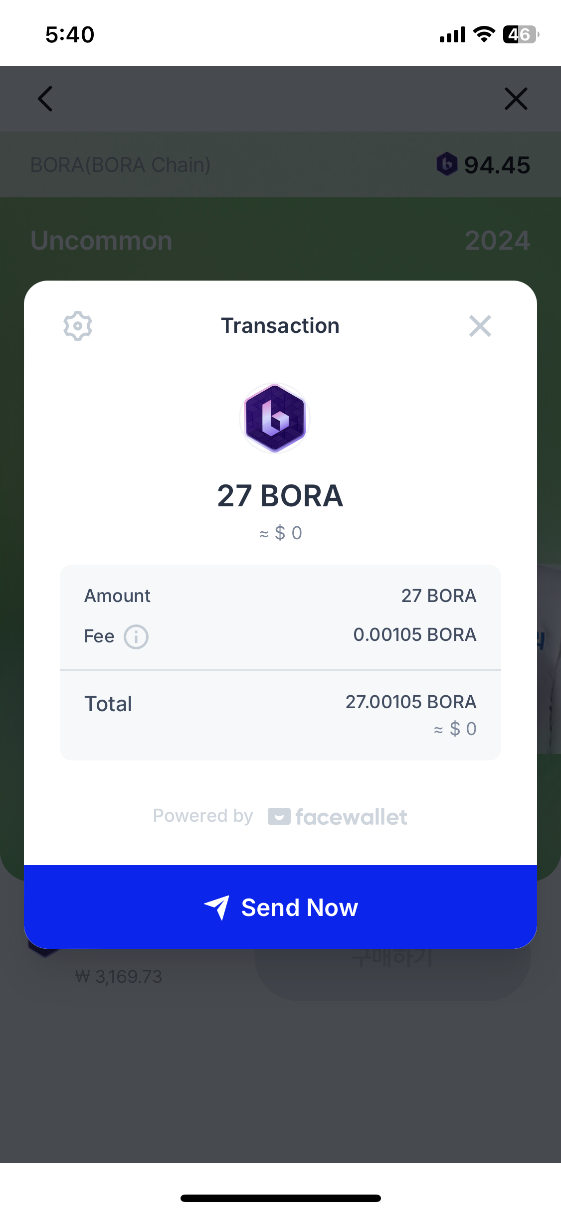 3. 해당 NFT를 BORA가 만든 거래 컨트랙트에 권한을 주기 위해 face-wallet으로 서명을 받는다.