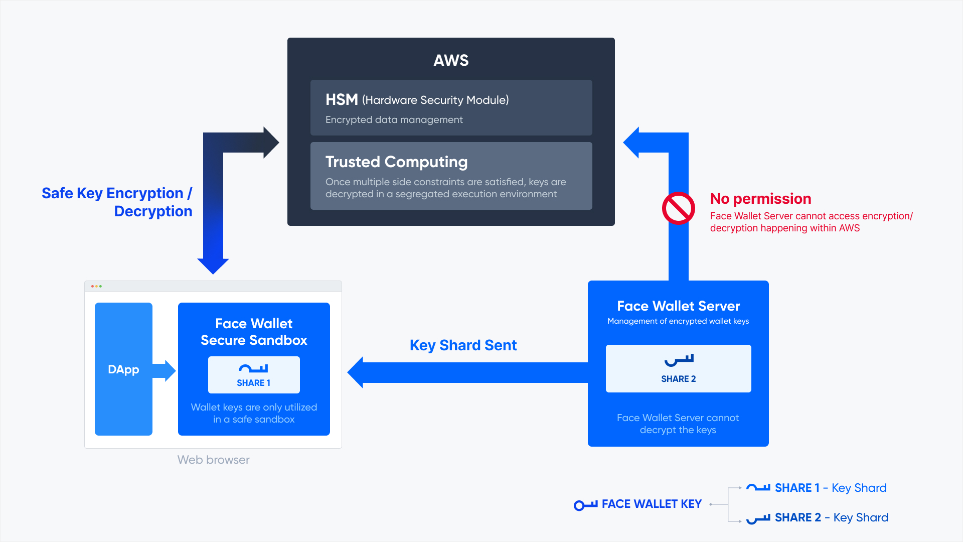 그렇다면 fw(face-wallet)란? 메타마스크는 데스크탑에서 이용할 시 크롬익스텐션으로 설치하고 실행 시 지갑 주소를 받게 되며 지갑주소 별 프라이빗키는 암호화하여 Local에 저장된다. 이후 컨트랙트가 연동된 웹에서 트랜잭션을 날리게 되면 메타마스크가 해당 트랙잭션에 프라이빗키로 서명을 이어주게 된다. 여기서 페이스월렛과 차이점은 페이스월렛은 별도의 설치 없이 서비스 도메인 별로 발급한 apikey와 블록체인 네트워크 정보를 가지고 face 객체를 만들어 이를 ethers라는 라이브러리의 Providers에 주입하여 프로바이더를 만들게 되고 만든 프로바이더로 트랜잭션이나 블록체인 메서드를 요청하게 되면 2개의 쉐어(사용자 웹 브라우저와 페이스월렛 서버)를 모아 신뢰할 수 있는 컴퓨팅 환경(AWS)에서 복호화하여 키를 얻어 서명을 하게 된다.