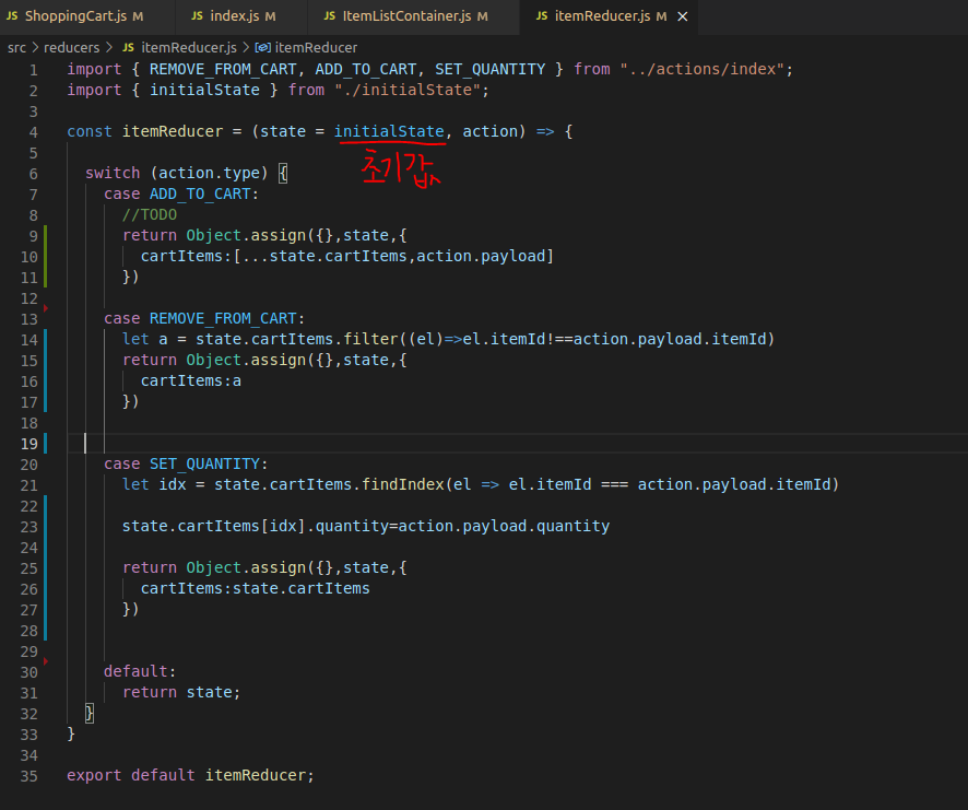 state로 초기값을 첫번째 인자로 두번째는 action으로 받을 객체이다. switch~case문에 의해 Case가 action의 type에 따라 state를 업데이트한다.