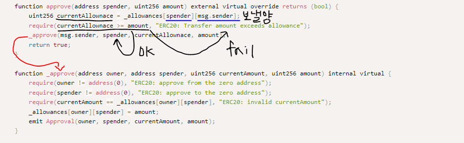 approve는 양도할 토큰값인 currentAllowance가 내가 현재 가지고 있는 토큰의 양보다 적은지 require를 사용해 검사합니다. 실제로 양도가 이루어지는게아니라 양도할 주소와 양을 정하는 과정이다.