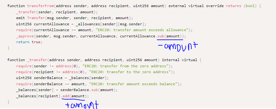 만약 오버/언더 플로가 발생한면 require문에서 제어하여 오류메세지가 나타나게 된다.