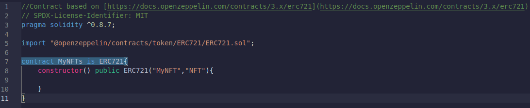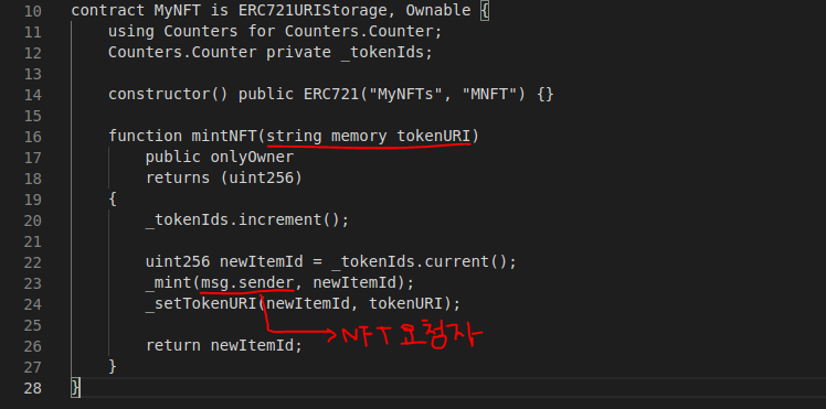 ERC721의 변수로 첫번째 MyNFT는 스마트계약의 이름이고 두번째 변수 NFT는 기호이다.